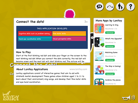 From drawing pictures to finding and matching objects… There are six different and fun games for children age +2 to develop fine motor skills, number recognition and replication, counting, finding and matching. Save your child's artwork to your photos.